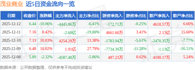 证券之星消息,截至2025年12月12日收盘,茂业商业(600828)报收于6.44元,下跌10.06%,跌停,换手率6.11%,成交量105.71万手,成交额6.93亿元。