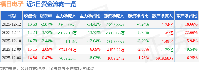 12月12日的资金流向数据方面,主力资金净流出9609.03万元,占总成交额14.42%,游资资金净流出2825.86万元,占总成交额4.24%,散户资金净流入1.24亿元,占总成交额18.66%。