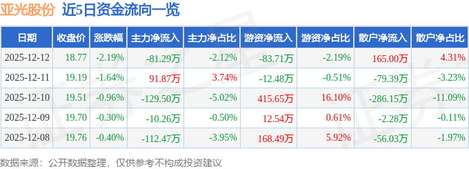 证券之星消息,截至2025年12月12日收盘,亚光股份(603282)报收于18.77元,下跌2.19%,换手率3.13%,成交量2.01万手,成交额3825.63万元。