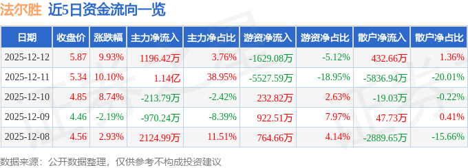证券之星消息,截至2025年12月12日收盘,法尔胜(000890)报收于5.87元,上涨9.93%,已连续涨停2天,换手率13.16%,成交量55.21万手,成交额3.18亿元。