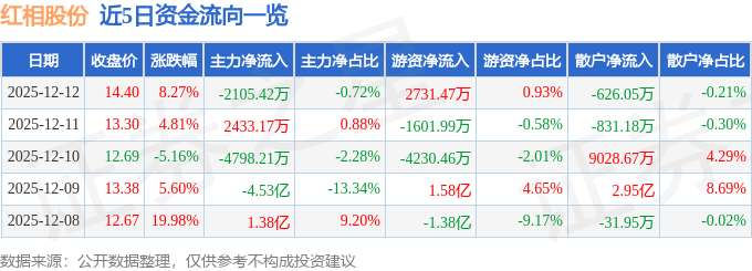 证券之星消息,截至2025年12月12日收盘,红相股份(300427)报收于14.4元,上涨8.27%,换手率41.53%,成交量208.88万手,成交额29.36亿元。