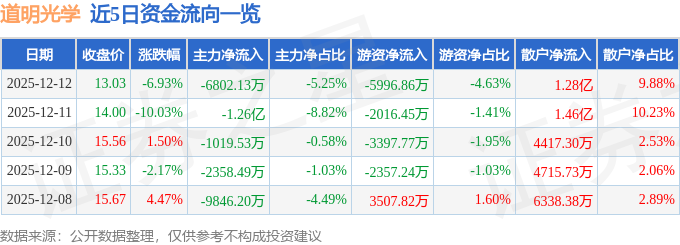 证券之星消息,截至2025年12月12日收盘,道明光学(002632)报收于13.03元,下跌6.93%,换手率16.76%,成交量97.52万手,成交额12.95亿元。