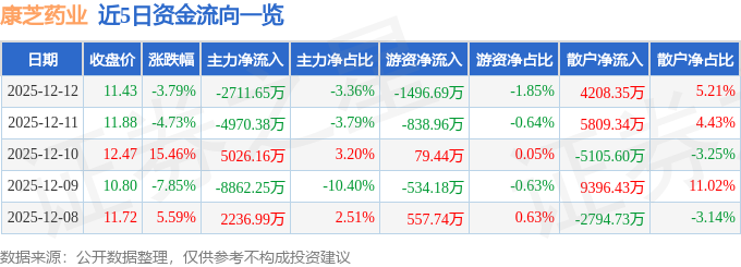 证券之星消息,截至2025年12月12日收盘,康芝药业(300086)报收于11.43元,下跌3.79%,换手率15.76%,成交量69.45万手,成交额8.08亿元。