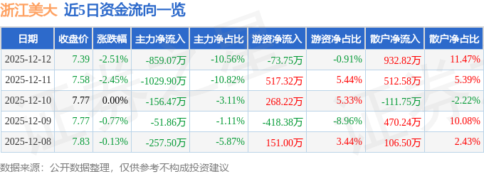 证券之星消息,截至2025年12月12日收盘,浙江美大(002677)报收于7.39元,下跌2.51%,换手率2.04%,成交量10.92万手,成交额8135.32万元。