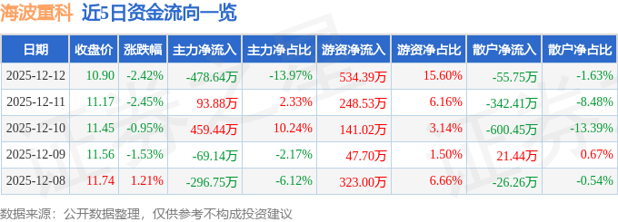 12月12日的资金流向数据方面,主力资金净流出478.64万元,占总成交额13.97%,游资资金净流入534.39万元,占总成交额15.6%,散户资金净流出55.75万元,占总成交额1.63%。