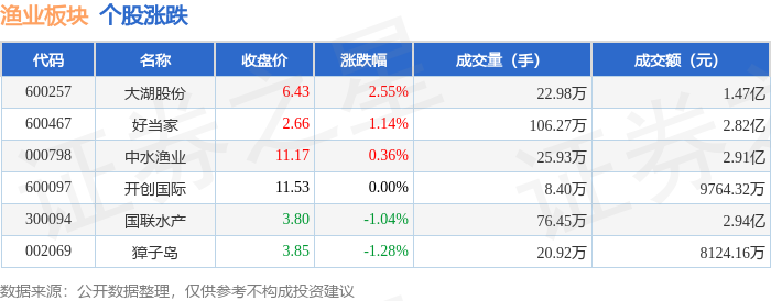 证券之星消息,12月12日渔业板块较上一交易日上涨0.27%,大湖股份领涨。当日上证指数报收于3889.35,上涨0.41%。深证成指报收于13258.33,上涨0.84%。渔业板块个股涨跌见下表: