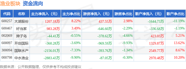 从资金流向上来看,当日渔业板块主力资金净流出3253.68万元,游资资金净流出2038.06万元,散户资金净流入5291.74万元。渔业板块个股资金流向见下表: