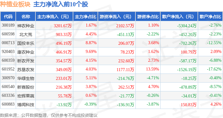从资金流向上来看,当日种植业板块主力资金净流出2586.47万元,游资资金净流入9400.86万元,散户资金净流出6814.39万元。种植业板块个股资金流向见下表: