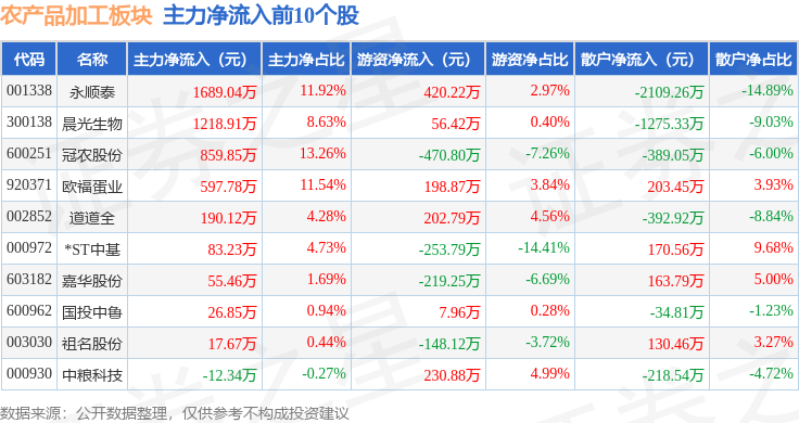 从资金流向上来看,当日农产品加工板块主力资金净流出1.38亿元,游资资金净流入605.37万元,散户资金净流入1.32亿元。农产品加工板块个股资金流向见下表: