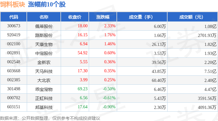 证券之星消息,12月12日饲料板块较上一交易日下跌1.16%,路德科技领跌。当日上证指数报收于3889.35,上涨0.41%。深证成指报收于13258.33,上涨0.84%。饲料板块个股涨跌见下表: