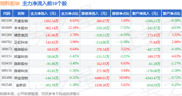 从资金流向上来看,当日饲料板块主力资金净流出1.21亿元,游资资金净流入6463.39万元,散户资金净流入5675.79万元。饲料板块个股资金流向见下表: