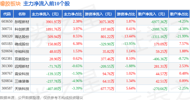 从资金流向上来看,当日橡胶板块主力资金净流入837.54万元,游资资金净流入5728.35万元,散户资金净流出6565.89万元。橡胶板块个股资金流向见下表:
