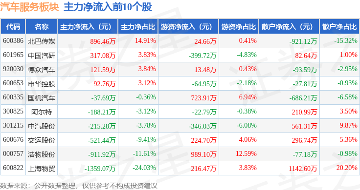 从资金流向上来看,当日汽车服务板块主力资金净流出7605.05万元,游资资金净流出2618.17万元,散户资金净流入1.02亿元。汽车服务板块个股资金流向见下表: