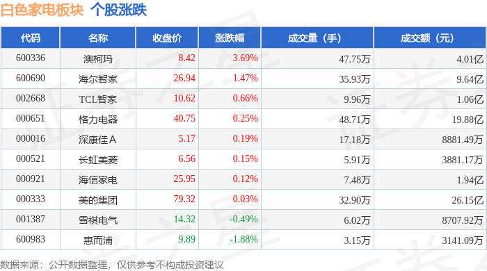 证券之星消息,12月12日白色家电板块较上一交易日上涨0.33%,澳柯玛领涨。当日上证指数报收于3889.35,上涨0.41%。深证成指报收于13258.33,上涨0.84%。白色家电板块个股涨跌见下表: