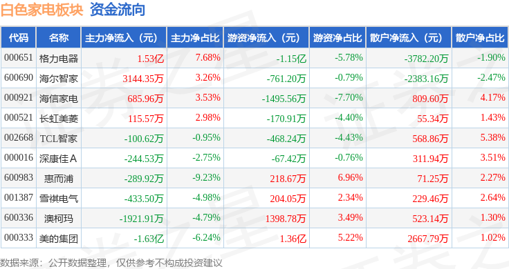 从资金流向上来看,当日白色家电板块主力资金净流出87.84万元,游资资金净流入1015.83万元,散户资金净流出927.99万元。白色家电板块个股资金流向见下表: