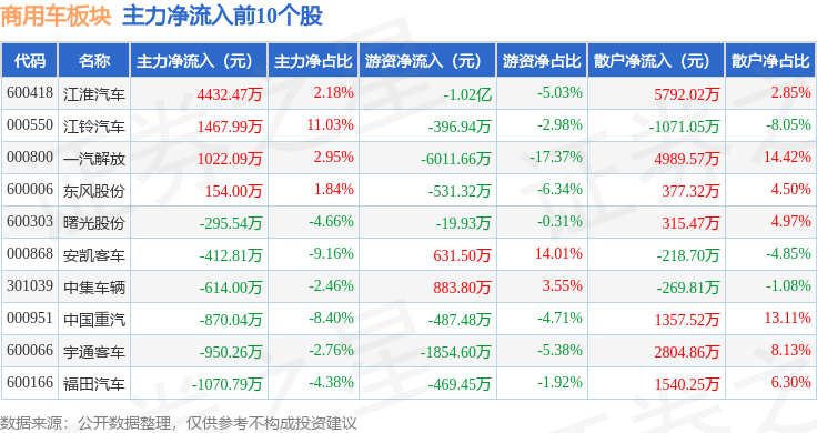 从资金流向上来看,当日商用车板块主力资金净流出2871.06万元,游资资金净流出1.67亿元,散户资金净流入1.95亿元。商用车板块个股资金流向见下表: