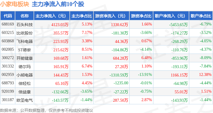 从资金流向上来看,当日小家电板块主力资金净流出8012.58万元,游资资金净流出5425.3万元,散户资金净流入1.34亿元。小家电板块个股资金流向见下表: