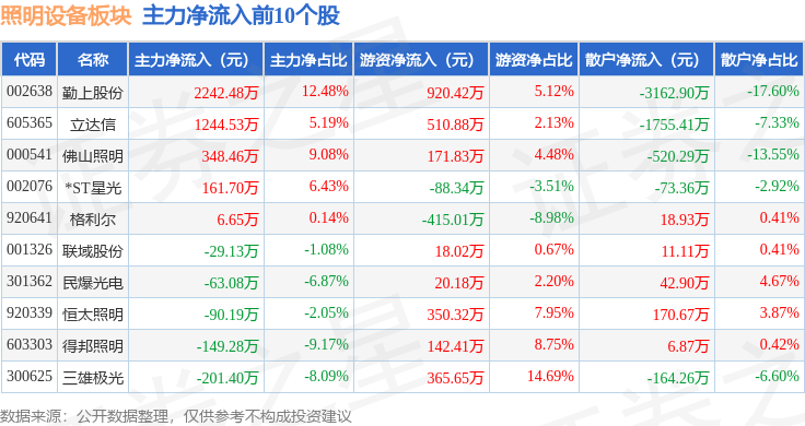 从资金流向上来看,当日照明设备板块主力资金净流入1943.85万元,游资资金净流入4012.81万元,散户资金净流出5956.66万元。照明设备板块个股资金流向见下表: