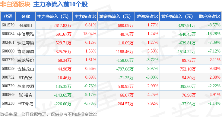 从资金流向上来看,当日非白酒板块主力资金净流出3369.94万元,游资资金净流入6177.3万元,散户资金净流出2807.35万元。非白酒板块个股资金流向见下表: