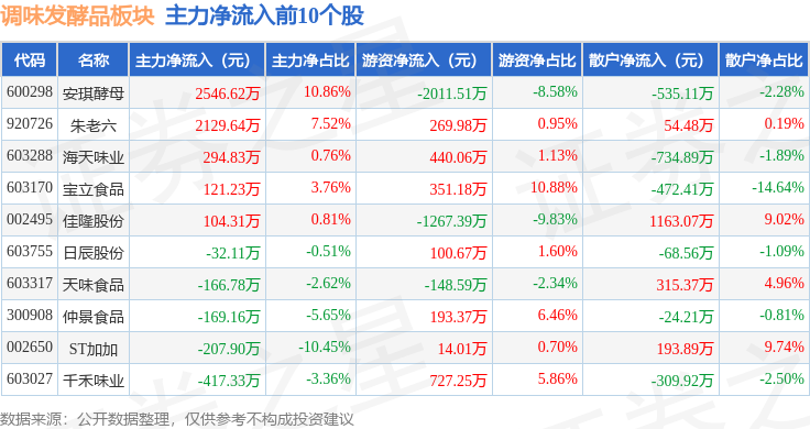 从资金流向上来看,当日调味发酵品板块主力资金净流出8540.52万元,游资资金净流出813.67万元,散户资金净流入9354.19万元。调味发酵品板块个股资金流向见下表: