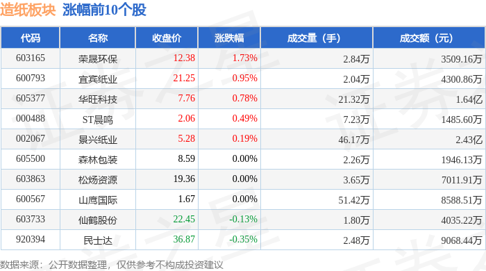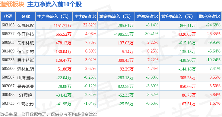 从资金流向上来看,当日造纸板块主力资金净流出3.75亿元,游资资金净流出1646.03万元,散户资金净流入3.91亿元。造纸板块个股资金流向见下表: