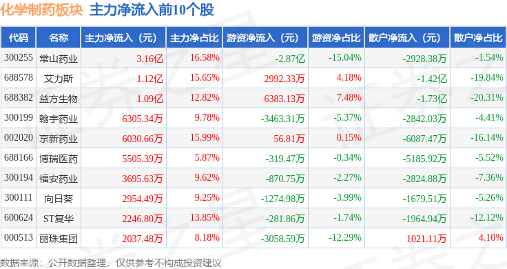 从资金流向上来看,当日化学制药板块主力资金净流出8.32亿元,游资资金净流入1.42亿元,散户资金净流入6.9亿元。化学制药板块个股资金流向见下表: