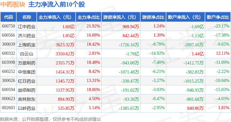 从资金流向上来看,当日中药板块主力资金净流出1.44亿元,游资资金净流出8876.18万元,散户资金净流入2.33亿元。中药板块个股资金流向见下表: