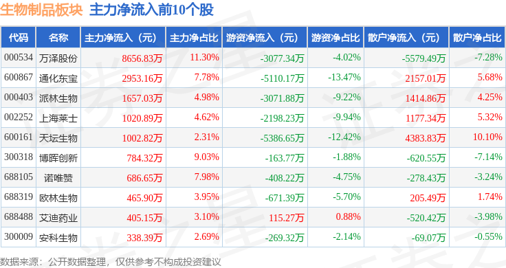 从资金流向上来看,当日生物制品板块主力资金净流出1.93亿元,游资资金净流出1.6亿元,散户资金净流入3.53亿元。生物制品板块个股资金流向见下表: