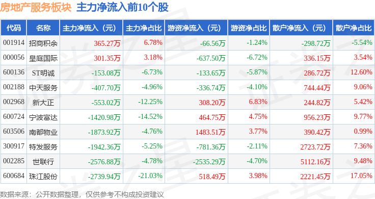从资金流向上来看,当日房地产服务板块主力资金净流出1.43亿元,游资资金净流出1037.23万元,散户资金净流入1.53亿元。房地产服务板块个股资金流向见下表: