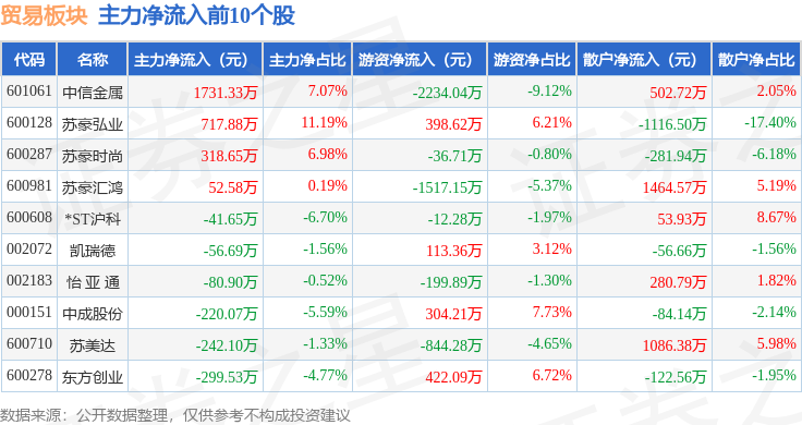 从资金流向上来看,当日贸易板块主力资金净流出7247.29万元,游资资金净流出5554.8万元,散户资金净流入1.28亿元。贸易板块个股资金流向见下表: