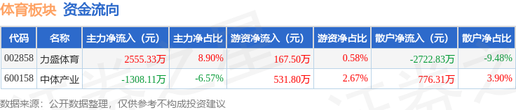 从资金流向上来看,当日体育板块主力资金净流入1247.22万元,游资资金净流入699.3万元,散户资金净流出1946.52万元。体育板块个股资金流向见下表: