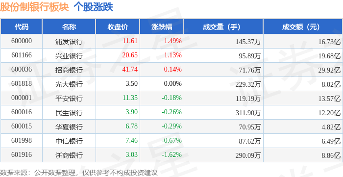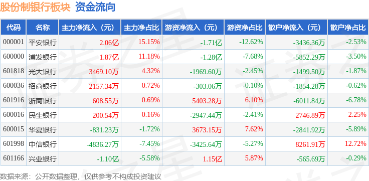 从资金流向上来看,当日股份制银行板块主力资金净流入2.91亿元,游资资金净流出1.8亿元,散户资金净流出1.11亿元。股份制银行板块个股资金流向见下表: