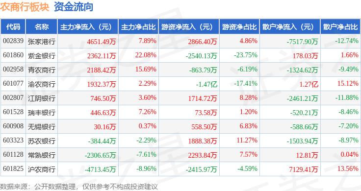 从资金流向上来看,当日农商行板块主力资金净流入4953.13万元,游资资金净流出1.11亿元,散户资金净流入6131.35万元。农商行板块个股资金流向见下表: