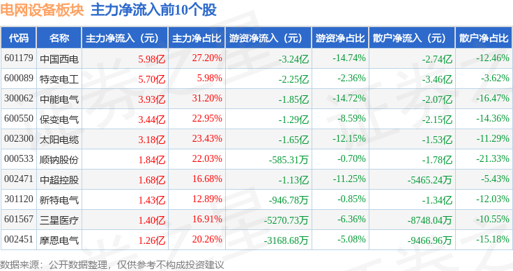 从资金流向上来看,当日电网设备板块主力资金净流入43.68亿元,游资资金净流出18.36亿元,散户资金净流出25.32亿元。电网设备板块个股资金流向见下表: