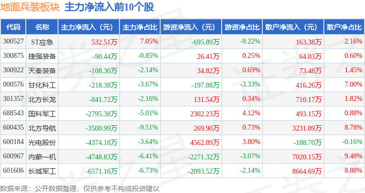 从资金流向上来看,当日地面兵装板块主力资金净流出8.34亿元,游资资金净流入1.28亿元,散户资金净流入7.06亿元。地面兵装板块个股资金流向见下表:
