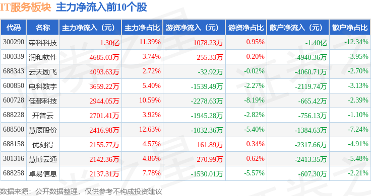 从资金流向上来看,当日IT服务板块主力资金净流出14.49亿元,游资资金净流出1.62亿元,散户资金净流入16.11亿元。IT服务板块个股资金流向见下表: