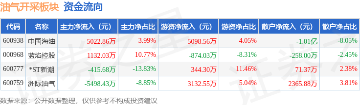 从资金流向上来看,当日油气开采板块主力资金净流入240.78万元,游资资金净流入7701.39万元,散户资金净流出7942.17万元。油气开采板块个股资金流向见下表: