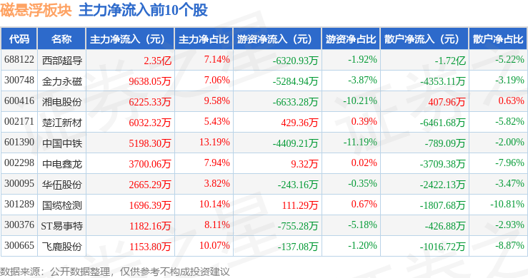 从资金流向上来看,当日磁悬浮板块主力资金净流出5926.14万元,游资资金净流入1.9亿元,散户资金净流出1.31亿元。磁悬浮板块个股资金流向见下表: