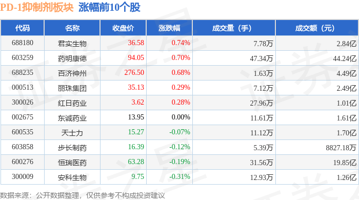 从资金流向上来看,当日PD-1抑制剂板块主力资金净流出11.73亿元,游资资金净流入5.34亿元,散户资金净流入6.39亿元。PD-1抑制剂板块个股资金流向见下表: