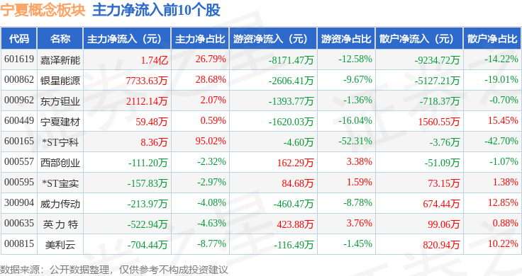 从资金流向上来看,当日宁夏概念板块主力资金净流入1.83亿元,游资资金净流出1.56亿元,散户资金净流出2735.17万元。宁夏概念板块个股资金流向见下表: