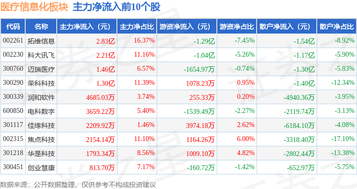 从资金流向上来看,当日医疗信息化板块主力资金净流入6414.48万元,游资资金净流出1.3亿元,散户资金净流入6618.85万元。医疗信息化板块个股资金流向见下表: