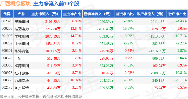 从资金流向上来看,当日广西概念板块主力资金净流出1.59亿元,游资资金净流出2453.96万元,散户资金净流入1.83亿元。广西概念板块个股资金流向见下表: