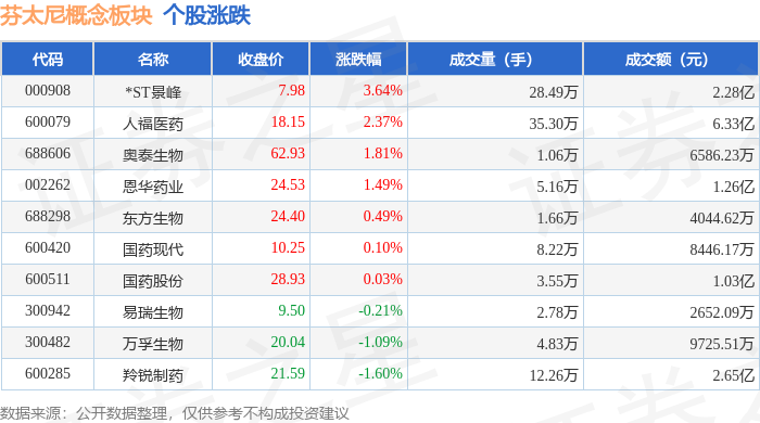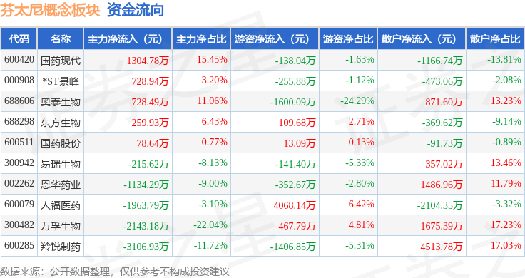 从资金流向上来看,当日芬太尼概念板块主力资金净流出5463.03万元,游资资金净流入763.77万元,散户资金净流入4699.26万元。芬太尼概念板块个股资金流向见下表: