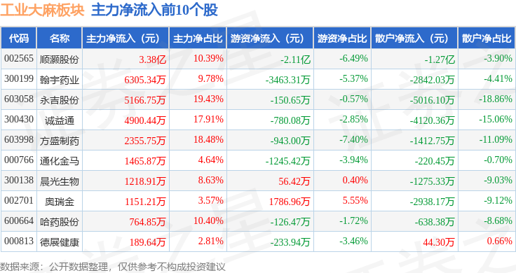 从资金流向上来看,当日工业大麻板块主力资金净流入4.21亿元,游资资金净流出2.39亿元,散户资金净流出1.82亿元。工业大麻板块个股资金流向见下表: