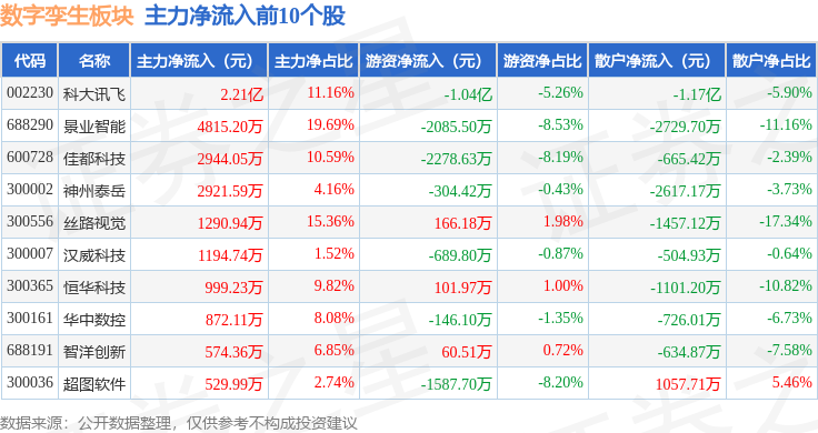 从资金流向上来看,当日数字孪生板块主力资金净流出4.99亿元,游资资金净流出2.97亿元,散户资金净流入7.96亿元。数字孪生板块个股资金流向见下表: