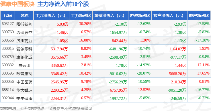 从资金流向上来看,当日健康中国板块主力资金净流出7.33亿元,游资资金净流入1.28亿元,散户资金净流入6.05亿元。健康中国板块个股资金流向见下表: