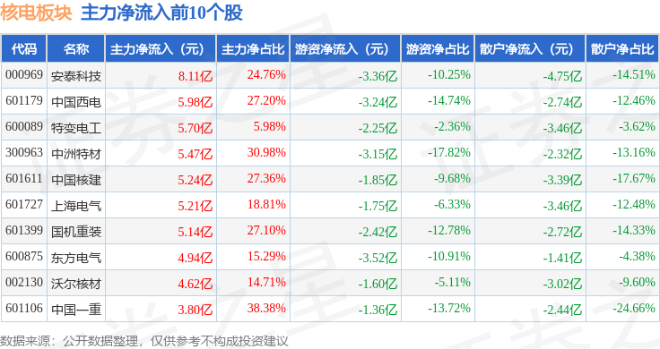 从资金流向上来看,当日核电板块主力资金净流入91.88亿元,游资资金净流出43.82亿元,散户资金净流出48.05亿元。核电板块个股资金流向见下表:
