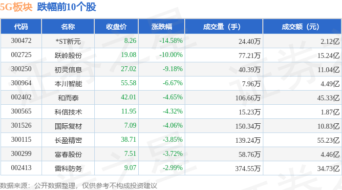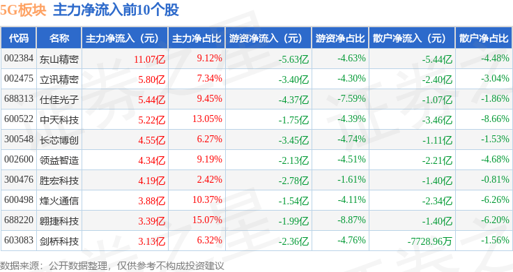 从资金流向上来看,当日5G板块主力资金净流出11.75亿元,游资资金净流出14.75亿元,散户资金净流入26.5亿元。5G板块个股资金流向见下表: