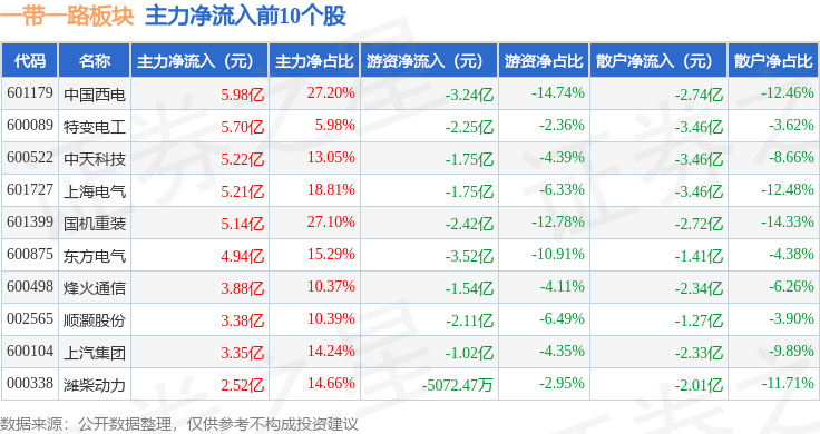 从资金流向上来看,当日一带一路板块主力资金净流入32.37亿元,游资资金净流出37.26亿元,散户资金净流入4.89亿元。一带一路板块个股资金流向见下表: