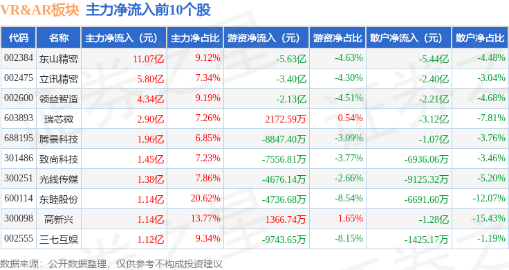 从资金流向上来看,当日VR&AR板块主力资金净流出14.84亿元,游资资金净流出10.1亿元,散户资金净流入24.94亿元。VR&AR板块个股资金流向见下表: